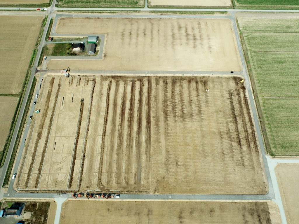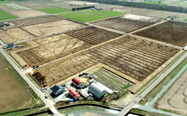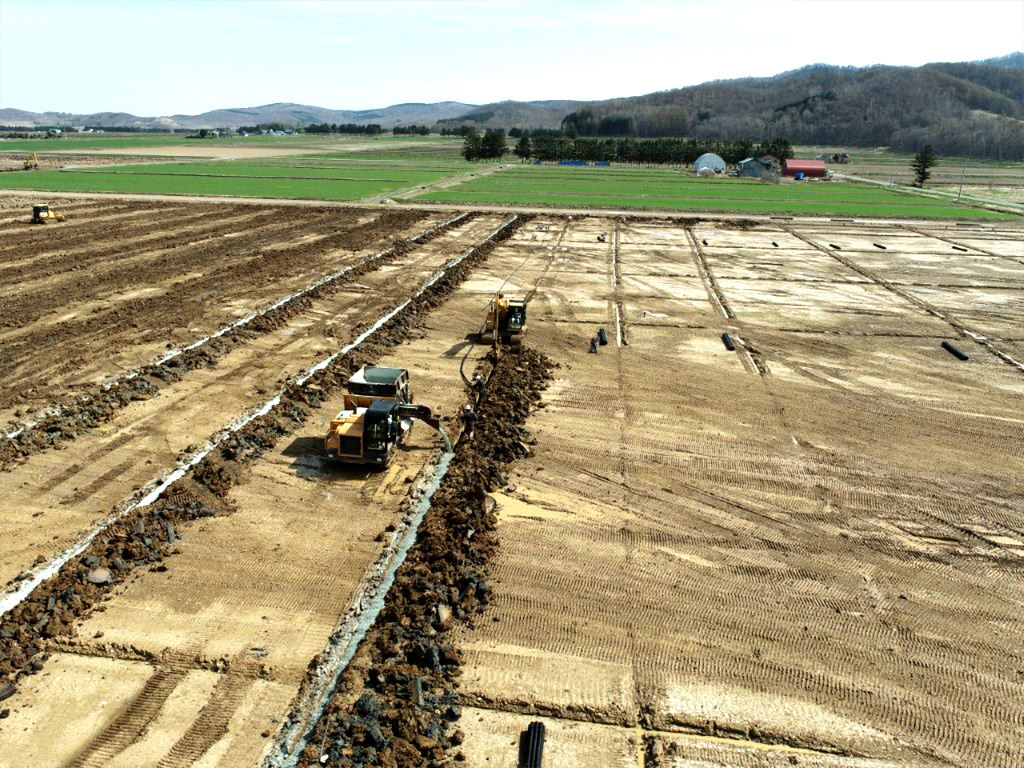 天塩川の清流の澄んだきれいな水が流れる士別市は道内でも有数の優良産地です。そんな士別市で育んだ作物の生産性を向上させるために生産基盤の整備として大型化された圃場の水はけを改善する暗渠排水の設置と農道の敷砂利を行いました。