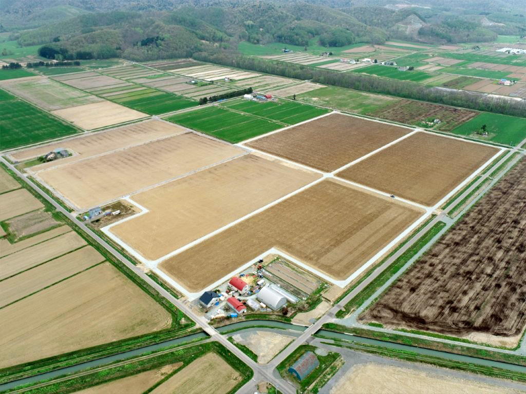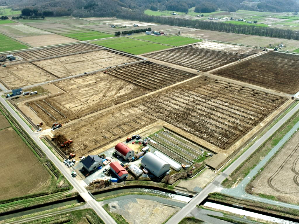 旭川空港の近くの山間にある波を打ったような地形の畑を一定の勾配に直したり、水はけをよくしたり、土壌を改良して農家の方がより良い多くの作物を収穫できるようにした工事です。