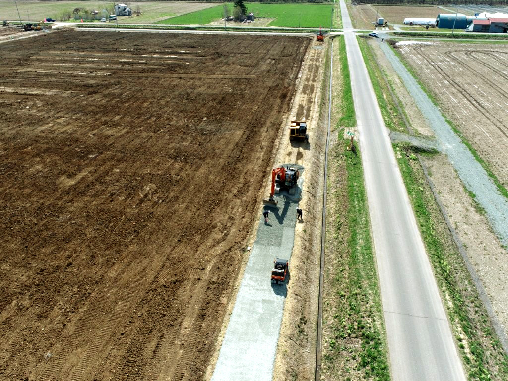 水田地帯における生産基盤の整備として元の小さなほ場を大型化し農作業効率を上げる付随工事です。農地の水はけを改善する暗渠排水の設置と農道の敷砂利を行いました。