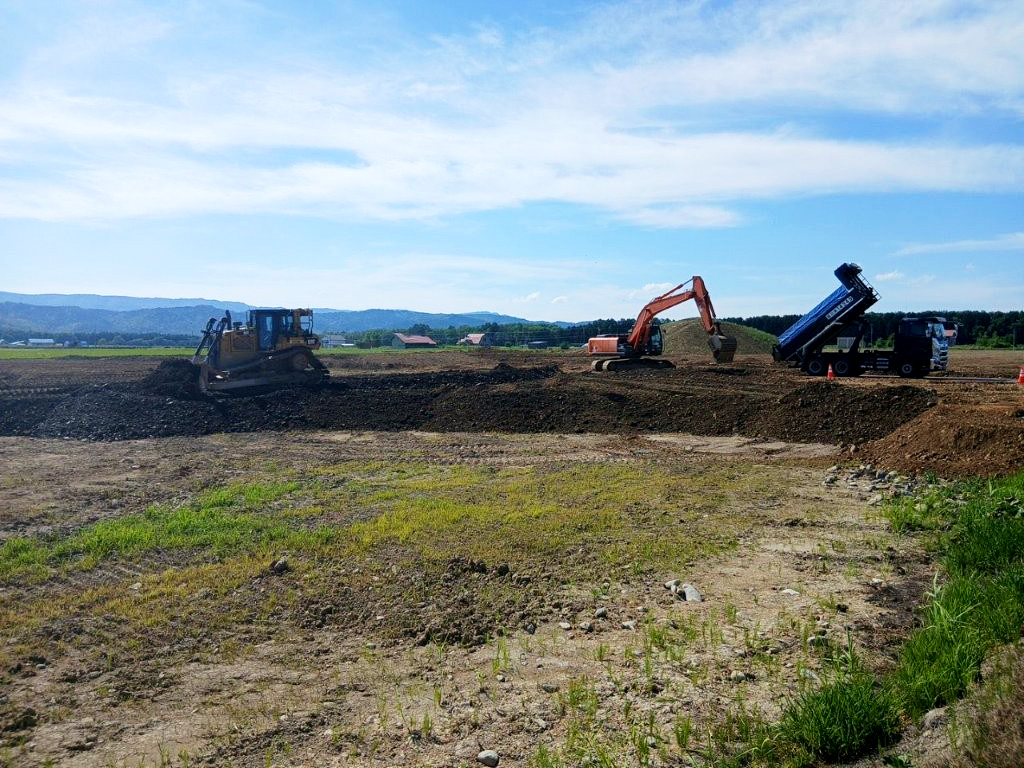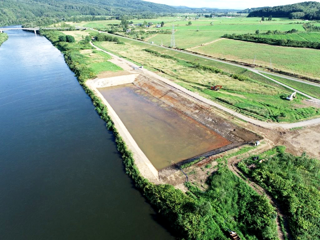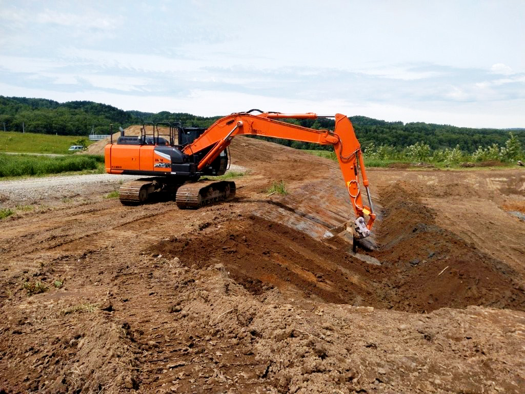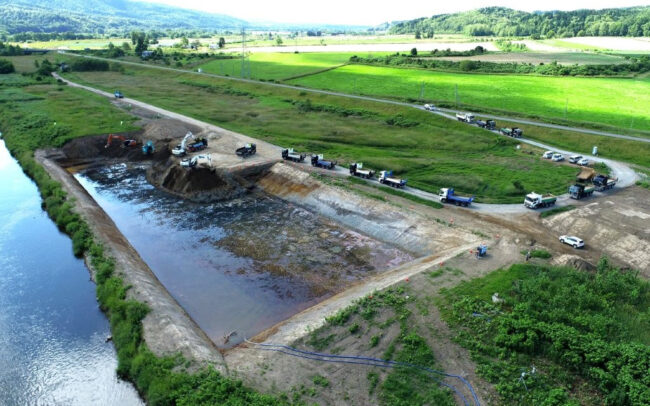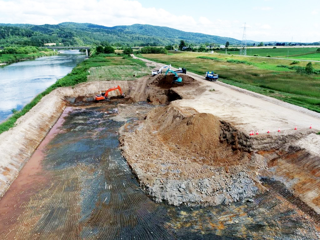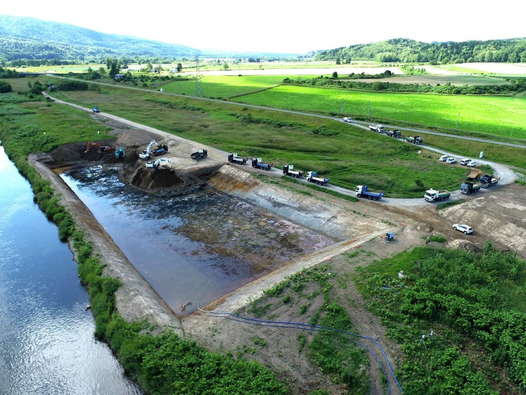 美深町にて、いのちとくらしをまもるに防災減災工事の美深パンケ築堤最終年度でした。 川に堆積した土砂を堤防補強を行い、河川増水時の築堤崩壊を防ぐために、堤防法面の植生工事をしました。