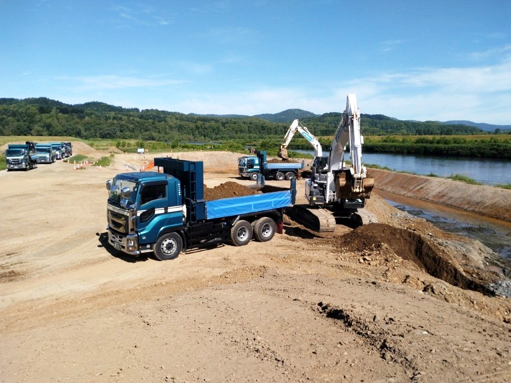 美深町を流れる天塩川にて防災減災工事です。河川増水時の水位上昇を軽減させ災害を未然に防ぐための河道掘削を行い、掘削した土砂は農地防災工事で使用しました。
